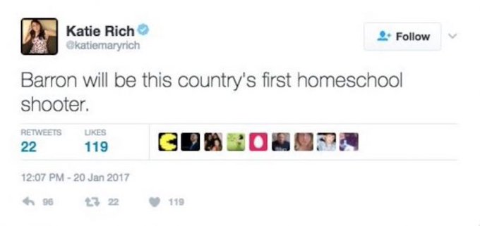 “Barron will be this country’s first homeschool shooter,” Rich tweeted on Friday, before later deleting the message and deactivating her Twitter account.