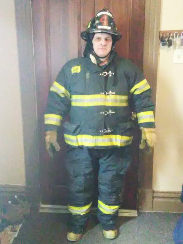 Submitted Photo Captain John Skelly of Murray Hose Four dressed in his fire gear. Skelly has been recommended to join a Dunkirk town fire department because he is the last volunteer in his department.